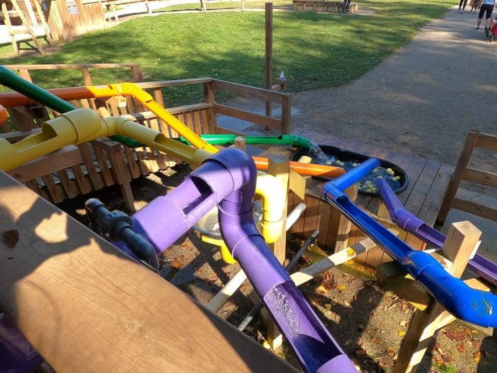 We played on the swings, flew down the zipline — more than once and probably to the chagrin of the kids waiting their turn, and got lost in the corn maze. We manipulated games where balls were guided through strategically placed holes and pumped handles furiously to get a strong gush of water propelling rubber duckies down a pipe system as they raced to reach the finish line first. We shot corn husks from a canon in an attempt to hit abandoned cars in the distance with the boys taking this task very seriously, strategizing angles and trajectory.