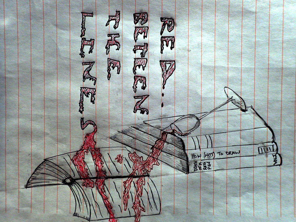The man snatched his wine glass from the table and slaked his nervousness. A dribble landed on his white suit shirt. He dabbed at it furiously, splotching the red more extensively around his shirt. He swore quietly under his breath.