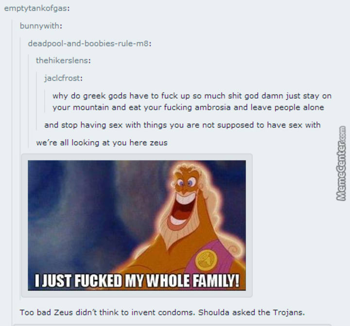 Oh, and if that’s not enough, the good-natured father Zeus in Disney’s Hercules had sex with pretty much every member of his family.