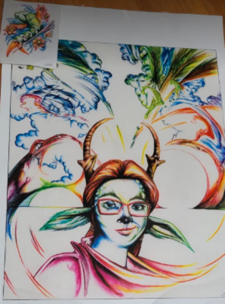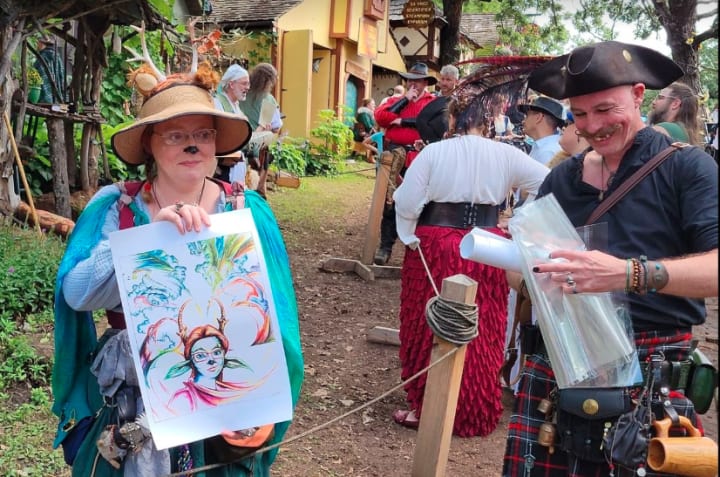 Then there was one man who weaponized his talents against me. Samuel is a patron who visited last season. He, his partner Candi, and I shared some laughs and one particular private joke. Samuel said to me after we shared this joke that I inspired him. That the look on my face when I told this joke would be great for a portrait and if he could take a couple of pictures of my expression so he could draw me in the off season. I was touched in that moment. Over the last year, the memory was never distant from my mind. On opening day, before cannon, I saw Samuel and Candi. He had the drawing, but wouldn't show me just yet. I let him know I had waited this long, I could wait a little longer. When he did show up to the Riddle Masters, he had the drawing for me. I warned him, "I'm going to cry. That's just going to happen."