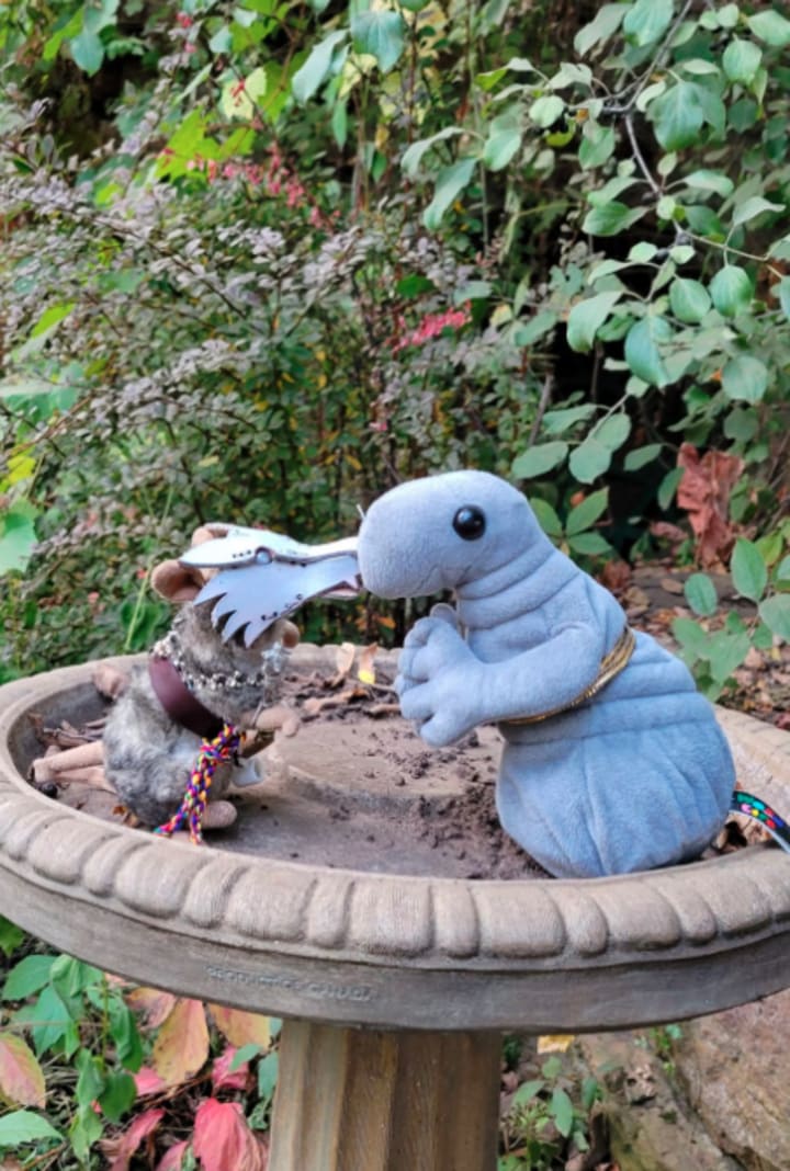 Late in the day on Sunday, I get to chatting with a few patrons and I recognize them from last year. They are the ones I told my riddling-out-of-surgery story to last year. We all light up to the memory and remembering each other. Then something catches my eye, one of them has a small stuffed creature in their purse called a WOSH, they named Josh. I am enamored by this stuffy. He is modeled after an art piece. He happens to be very close to the size of my stuffed giant elephant mouse Richard A Boudit. I ask if I can take a picture of the two of them together, 'Flat Stanley-style.' Immediately the narrative is born and I don't know who said what. "It looks like a wedding...they were 'roommates.'...This looks like a wedding I would want to have." Never have two stuffies been so in love at first sight.