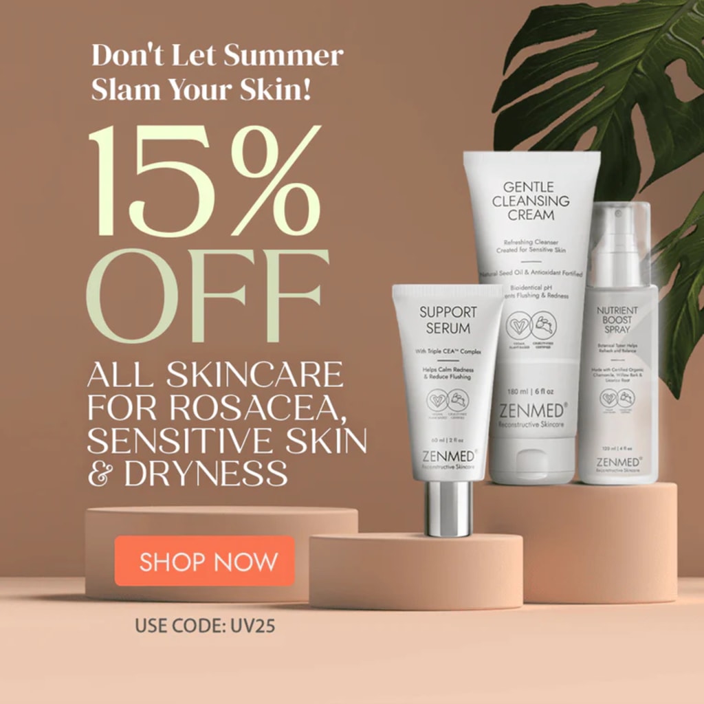 Zenmed offers specific bundles and kits designed for people with rosacea. Always start slowly with new products—try one at a time to see how your skin reacts.
