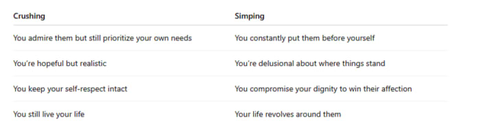 At the end of the day, emotions are messy. But understanding the difference between crushing and simping can save you a lot of heartache, wasted time, and mental gymnastics.