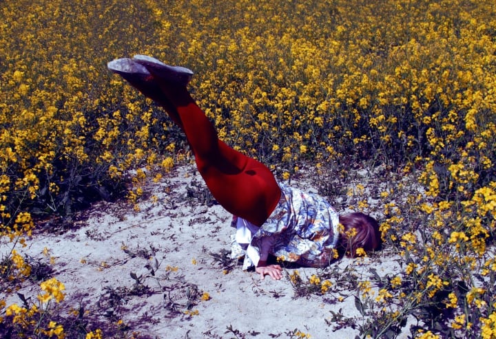 Isabelle Wenzel is a contemporary German photographer who also studied acrobatics, which she uses in her richly palleted self portraits. The works are often set out of doors in natural environments or in domestic interiors and always involve the body contorted into an unnatural position. Her photos work to invert ideas about the female body and the role of the female body in a variety of settings; their single figure also express a solitude, or aloneness, in the experience of being female, and more broadly, human.