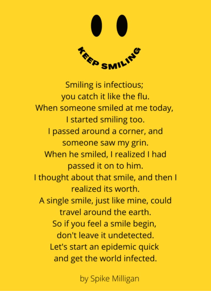 He wrote a poem called "Keep Smiling." He writes that a simple smile can go a very long way. I think we should try and inject some positivity into our negative world.