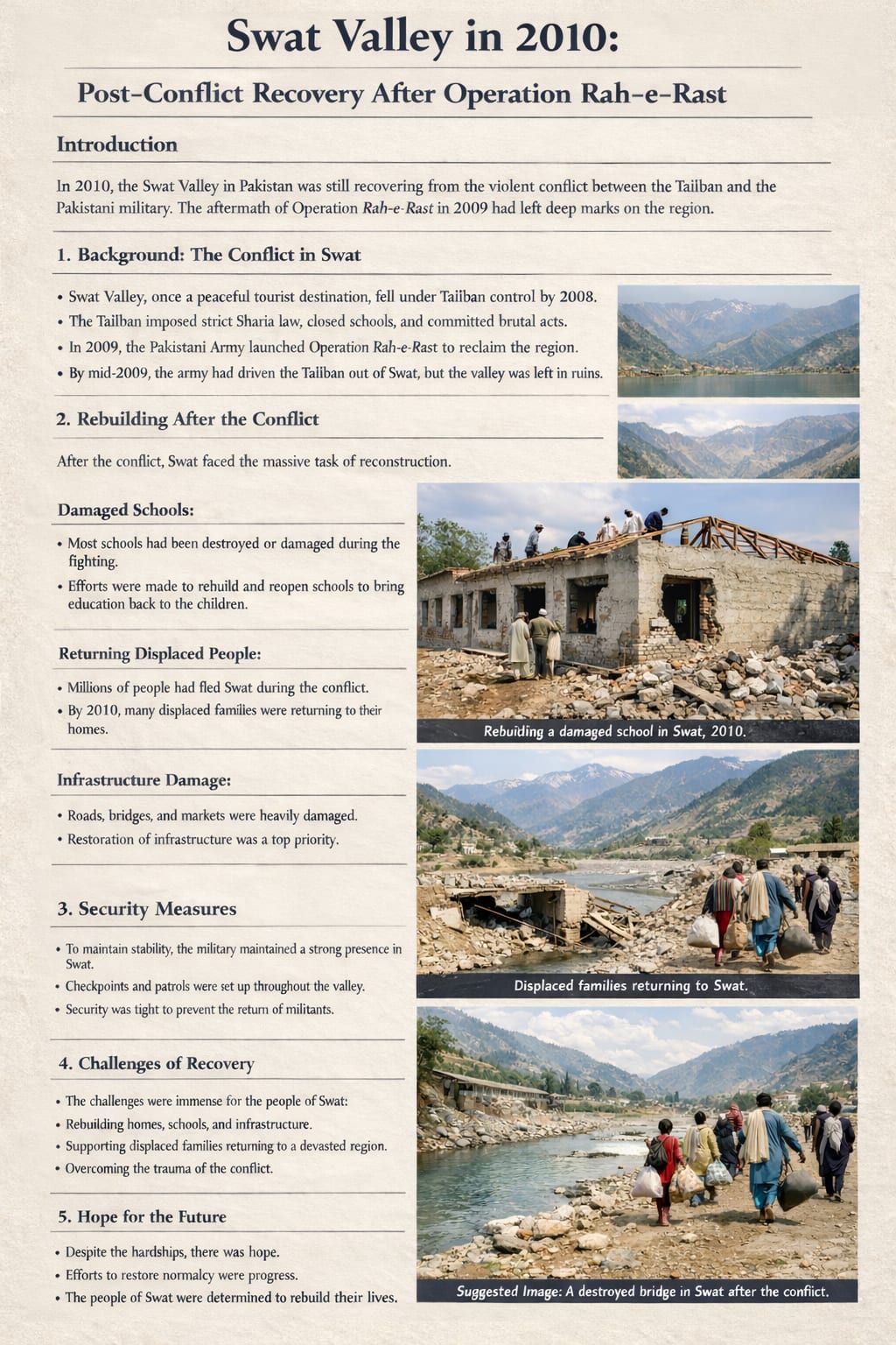 The year 2010 holds deep historical significance for the Swat Valley in Pakistan. While the military operation Rah-e-Rast was officially launched in 2009, its aftermath defined 2010. This period was marked by the slow return of peace, the rehabilitation of millions of displaced civilians, the rebuilding of destroyed infrastructure, and the psychological recovery of a society that had endured years of militant control.