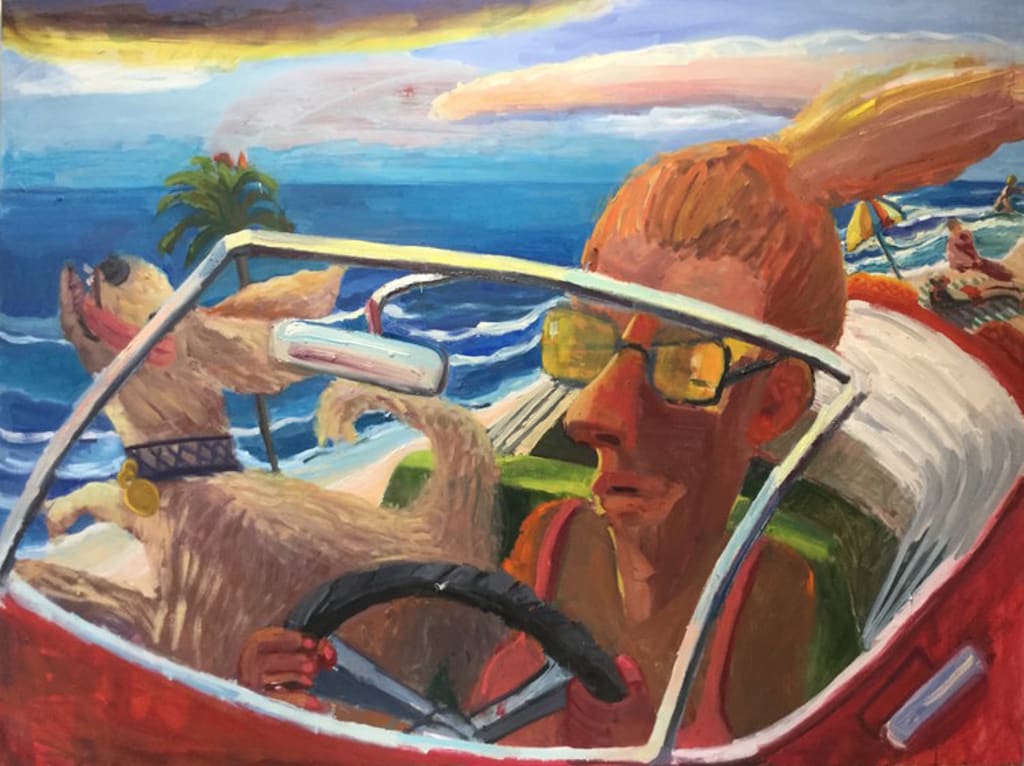 Clara Shen was sitting in her Tarrytown Studio a few years ago, and had the impetus to go for a ride. Instead, the Chinese immigrant began splattering a colorful sports car road trip alongside the ocean. At the same time, the death of friend's dog provided further inspiration, so a four legged creature signals a joyful yelp at shotgun. But despite a multilevel kaleidoscope call across species—which screams for a buyer—Shen still sees deficiencies, and the pull of perfectionism.