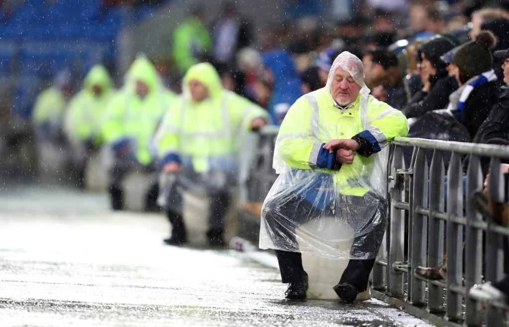 Except one, who still sits still as a statue, the game behind him out of sight; his hi-viz jacketed backed at it, watching the watchers watch the clock, watching the ref holding hope to his lips and at the back of his throat.