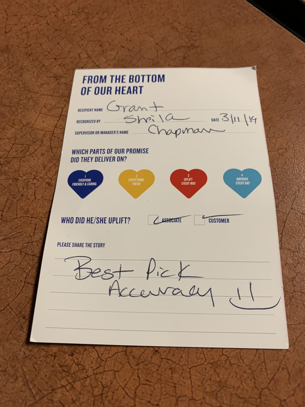 When the customer arrives, we take orders out through the slow warmth of spring, the intense heat of the Georgia summer, the flash rains of storm season, the comfort of autumn, or even the cold of the winter. Our part of the parking lot only has eight spaces, and we only have two working tablets and six carts that we can use to bring groceries out with, so we can't serve every customer at once in the event of a rush either when people just start getting off work at five in the afternoon or on a weekend. However, we like to try to be quick in our store and serve as many people as we can as efficiently as possible, being sure to organize their groceries so nothing breaks. Our customers don't seem to mind the wait too often.