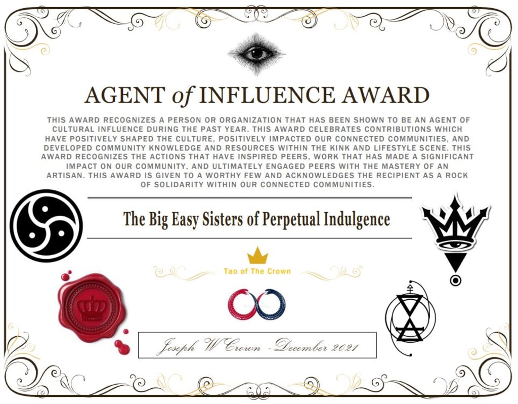 As we celebrate the upcoming end of the year 2021, I'll be bestowing Agent of Influence Awards to individuals and organizations who have used their influence to improve culture, visibility, depth of knowledge, and the lives of others through their efforts in the areas of hypnosis, influence, BDSM, kinky community and personal development, and relational kink culture. The first to be recognized this year is The Big Easy Sisters of Perpetual Indulgence. Their work to share a sex and kink positive perspective, decreasing stigma, shame, and guilt for LGBTIQQ people is a refuge for many. Their work to provide resources for sex positive education, community and personal development, and empowerment are invaluable. They also are a group that believes in and actively works to create a better world for our youth, and those discovering themselves for the first time.