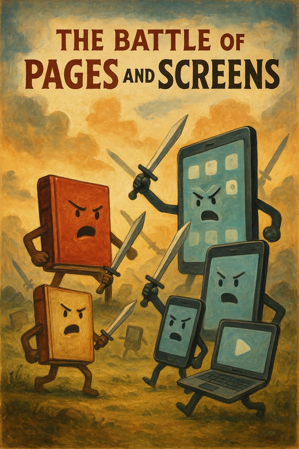 Across the Valley of Knowledge, armies gathered. On one side stood the warriors of literature, armed with quills, bookmarks, and the scent of old paper. On the other marched glowing devices, their screens flashing like shields, their chargers coiled like whips. The air buzzed with tension.