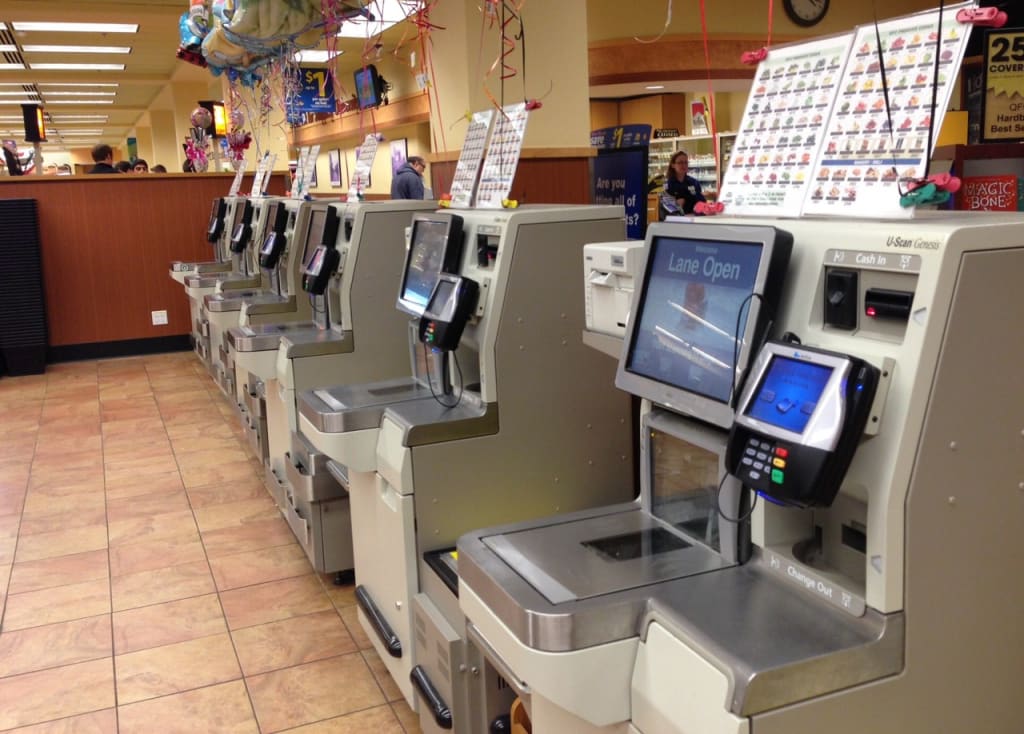Instead I find myself surrounded by a dozen automated cashiers and a single breathing, human clerk with a questionnable haircut stationed center his robot army of cashier-troopers.