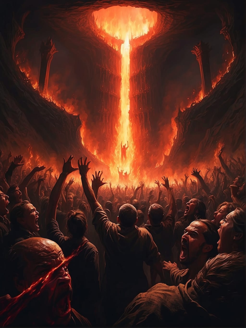 In the final days, when the world is consumed by flames and the earth trembles with the weight of its sins, a darkness like no other shall descend upon the land. The skies will be ablaze with fire, and the air thick with the stench of brimstone. It is the Day of Judgment, the Day of Reckoning, when all shall be held to account for their deeds, both good and evil.