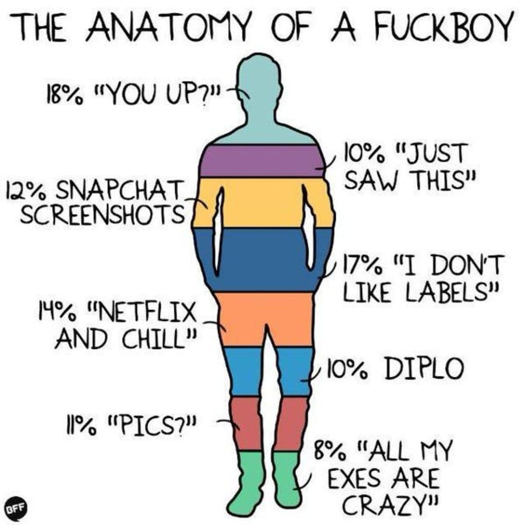 So in case you are living under a rock I will define fuck boy and explain what I mean by the guys who create baggage. So a fuck boy is the guy who just want sex. They're usually complete assholes and sometimes flakes. I'm sure they're the ones who created the saying "catch (fill in the blank) not feelings." They will pretend to care about someone and to not be a fuckboy. These guys have to hang out on their terms. They are usually sleeping around.