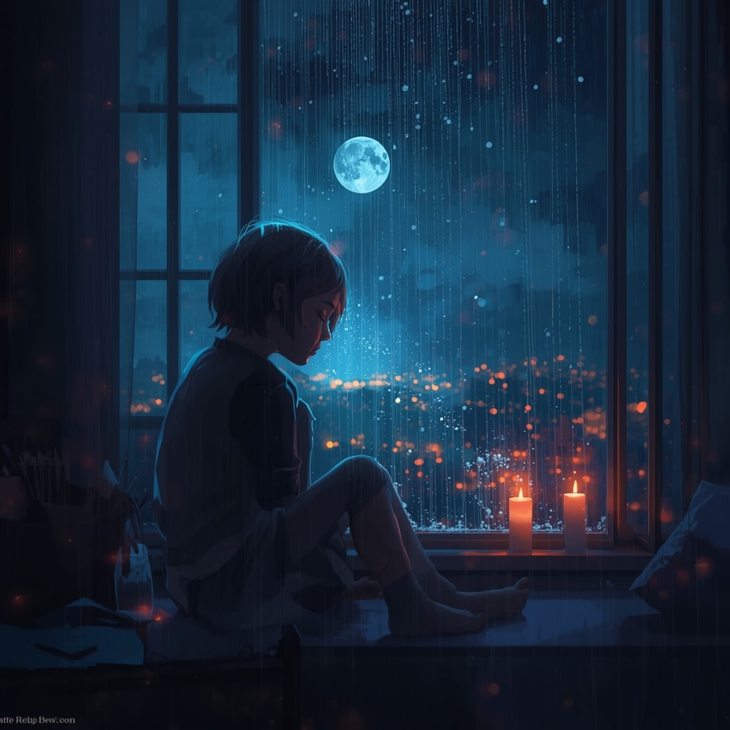 She sat by the window and began to cry. Her tears spilled down her face, glowing faintly in the candlelight. The boy watched, unmoving. The air filled with the soft hum of her grief.