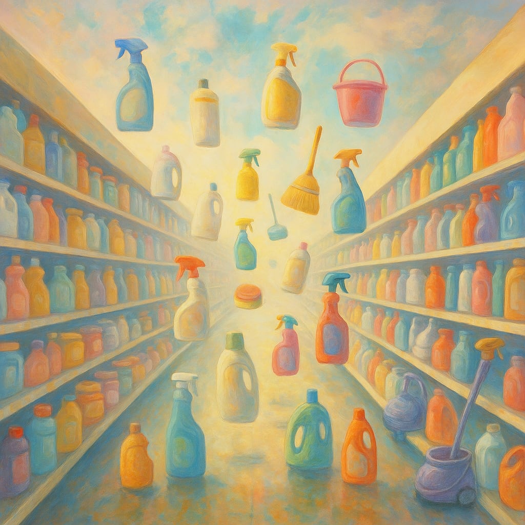Supermarkets offer entire aisles of cleaning supplies—aisles so long and sparkly they look like heaven’s janitor closet. There are sprays for granite, sprays for stainless steel, sprays for air, sprays for other sprays. There are mops that swivel, steam, and whisper encouragement. There are wipes infused with lavender, eucalyptus, and the tears of exhausted mothers.
