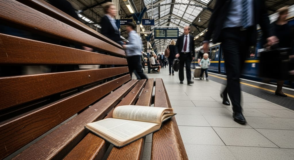 Maya shifted her weight on the cold metal bench, her fingers tightening around a worn book. Around her, the crowd buzzed—earbuds in ears, scrolling thumbs, bags pressed to chests. Strangers sharing the same space, breathing the same damp city air, yet suspended in separate orbits.