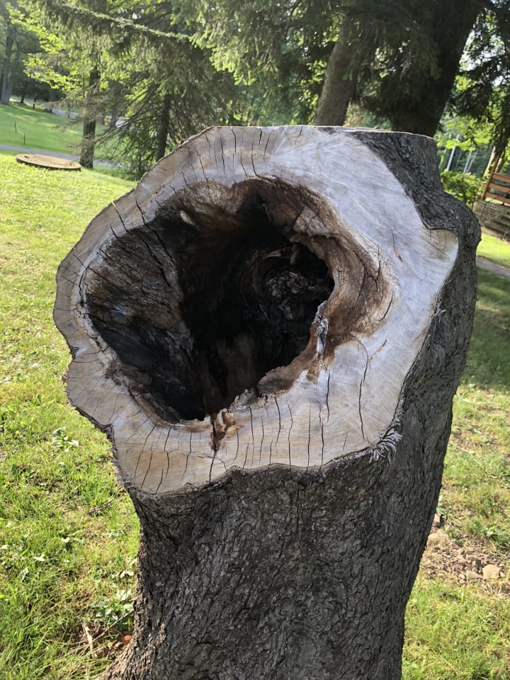 As I put my hands back into my jacket pocket, I heard a noise that sounded like an owl. Hey, I could not help myself; my mind kept thinking about the owl from my childhood. Then I heard the noise again. I thought, "This must be in my head." When I sat on the grass, my gut told me to check a trash can on my right. There was no trash can, but I observed a tree stump with a large hole. I looked at the tree stump, then moved closer, and behold... there were my car keys lying inside a hole.