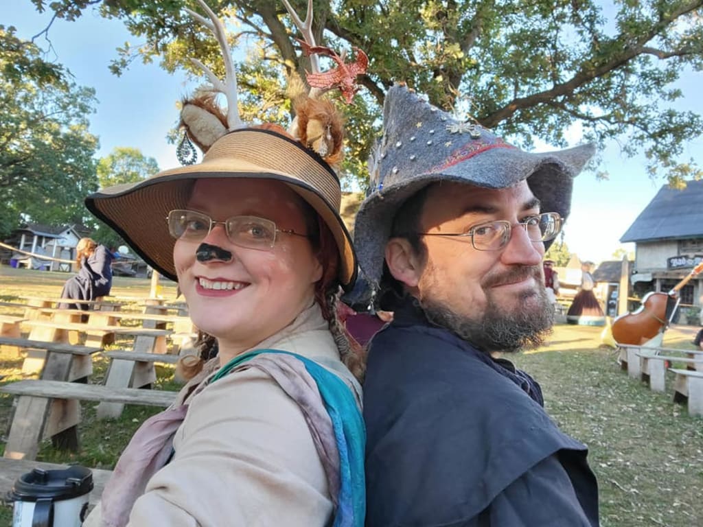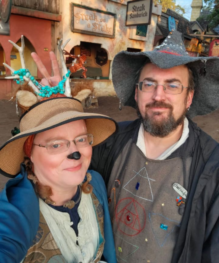 Nestor starts to approach from down the lane. Holly shows us some of the treasures she has collected from the princesses and other cast members from the festival. Nestor pulls out a piece of his alchemist's gold, does a little slight of hand magic for her. I didn't know he could do that. Holly is too clever and points out how he did it. He gives her the piece of gold and I give her a four-leafed clover. She shows us the place she hides her treasures. Kat it grateful for us taking on a little 'uncle energy' as we call it this morning before they get breakfast.