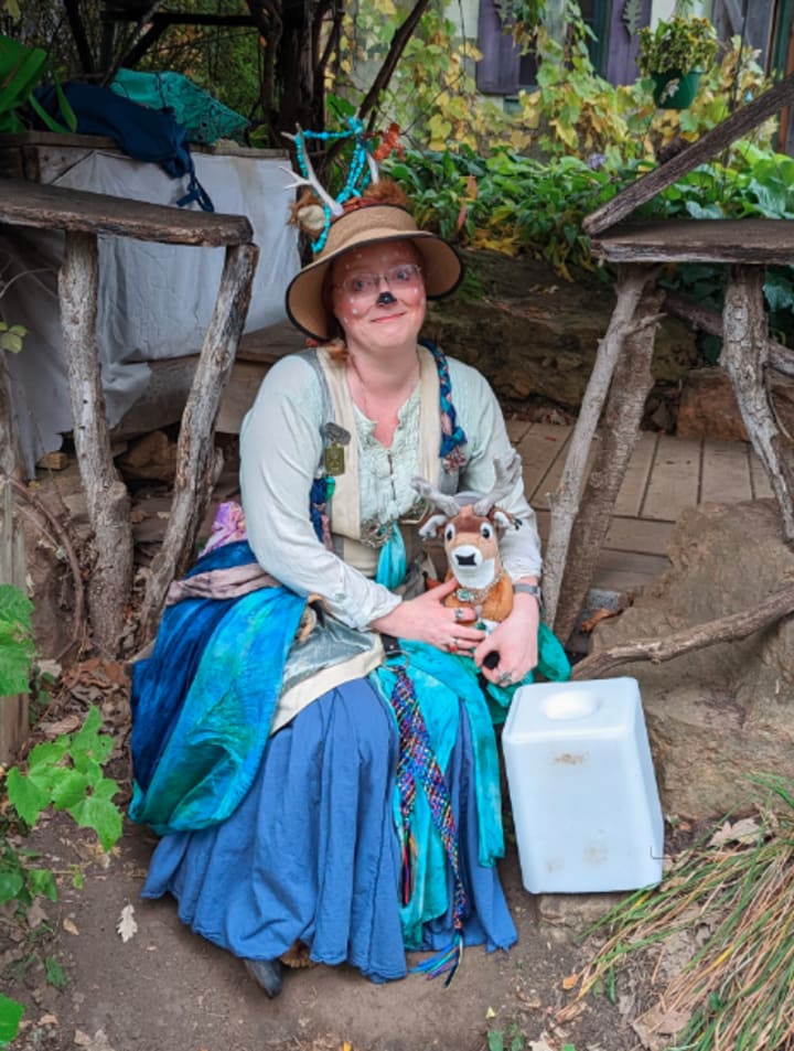 Holly was fascinated by my costume, especially my 'pet,' my giant elephant mouse Richard A. Richard A is fully accessorized with a mask, belt, pouch, and most recently a tiny coffee mug. Holly thought Richard looked thirsty and wanted to give him a drink of water. Cue Holly bringing her mug of water ready to pour over the front of my skirt to give Richard a drink. She doesn't though. She perfectly pours a few drops of water into his cup, which is about all his cup can hold. I make Richard 'drink' out of the cup and thank her with a bow.