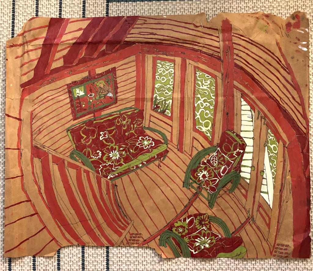 In the case of the first attached image, I climbed into a boathouse loft with my salvaged sheet of paper, and spent several hours sketching and painting the wooden beam-and-plank room I saw below. To grasp as much of the room as possible, I tried to force a kind of fish-eye perspective on the space. It remains, to date, one of my favorite paintings I’ve done. And the act itself, of making that picture, remains one of my favorite memories.