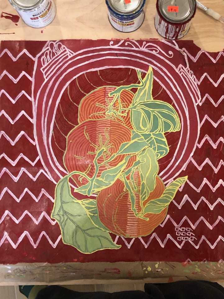 I may not have the cash for actual canvases, and I may use paints from the hardware store -- stinky stuff, intended more for fences and walls than for art -- but those details do not seem to matter. If you care about art, you will find a way, whatever you have; materials are to me, basically incidental -- immaterial. The will to create is far more important in an artist than his or her means of creating. That is why I believe art is so fundamentally egalitarian. For my painting surface, case in point, I reclaim a supply that virtually anyone can get their hands on for next to nothing: brown paper grocery bags. I think I can fairly call it a paper choice for the people!