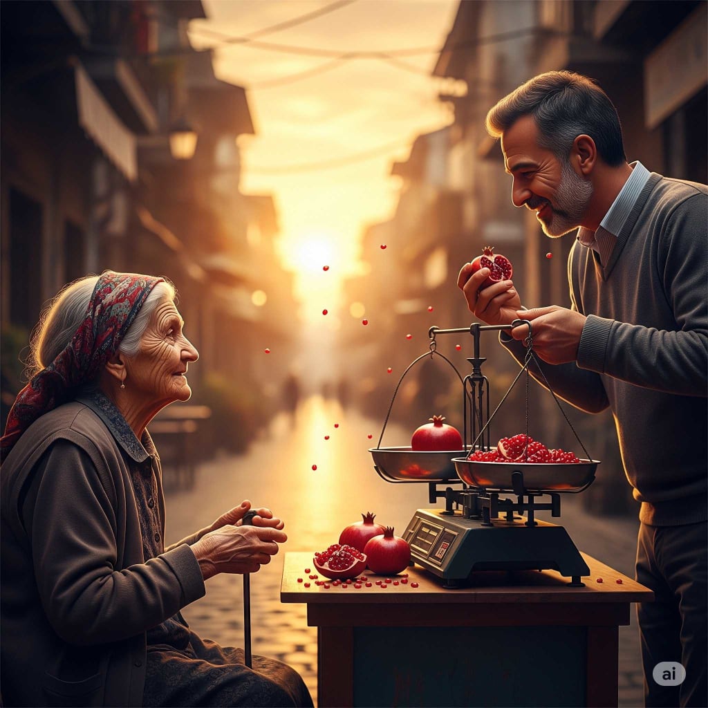 The old woman smiled softly, a sparkle of understanding in her eyes, and gently replied, “I know why he does it. He wants me to enjoy a pomegranate, without making me feel indebted to anyone. He thinks that I am unaware of his kindness. But the truth is, I am fully aware of his love and generosity. It’s not that I weigh extra pomegranates because of his complaints. Rather, it is his compassion that tilts the scale. His kindness lightens my burdens and sweetens my days, so I too add one extra pomegranate, for his kindness deserves to be answered with kindness.”