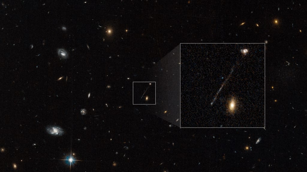 This scenario nonetheless makes the as-yet-unnamed object fascinating since it is extremely huge for a galaxy we are witnessing so far back in time, even though it is less romantic than a fleeing black hole trailing stars.