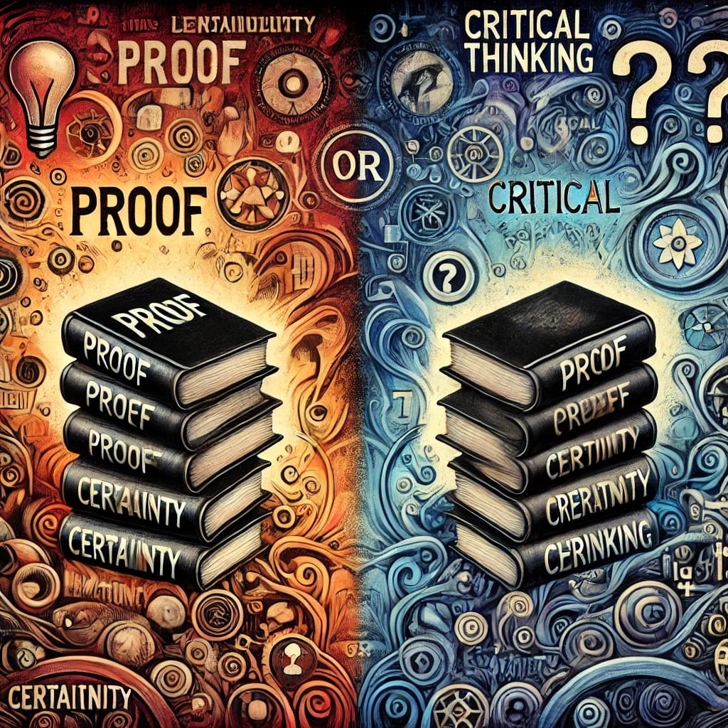 This is the essence of critical thinking: the courage to explore the unknown without needing guarantees. It’s about intellectual bravery. People who need proof aren’t brave. They’re hiding behind their need for certainty because they can’t handle the responsibility of thinking for themselves. They wait for someone else to tell them what’s true so they don’t have to decide for themselves.