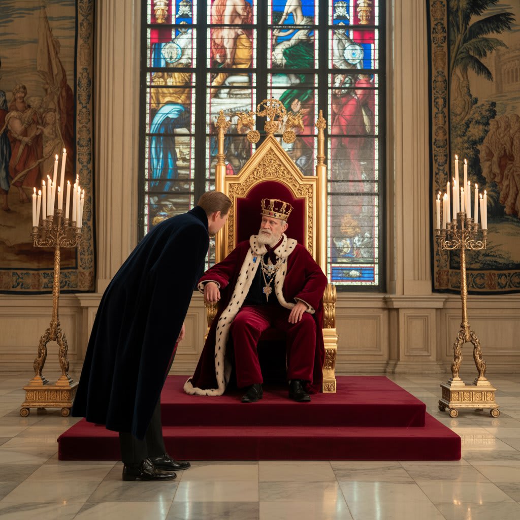 Royal Court Scene — A majestic throne room with the king and the stranger presenting himself.