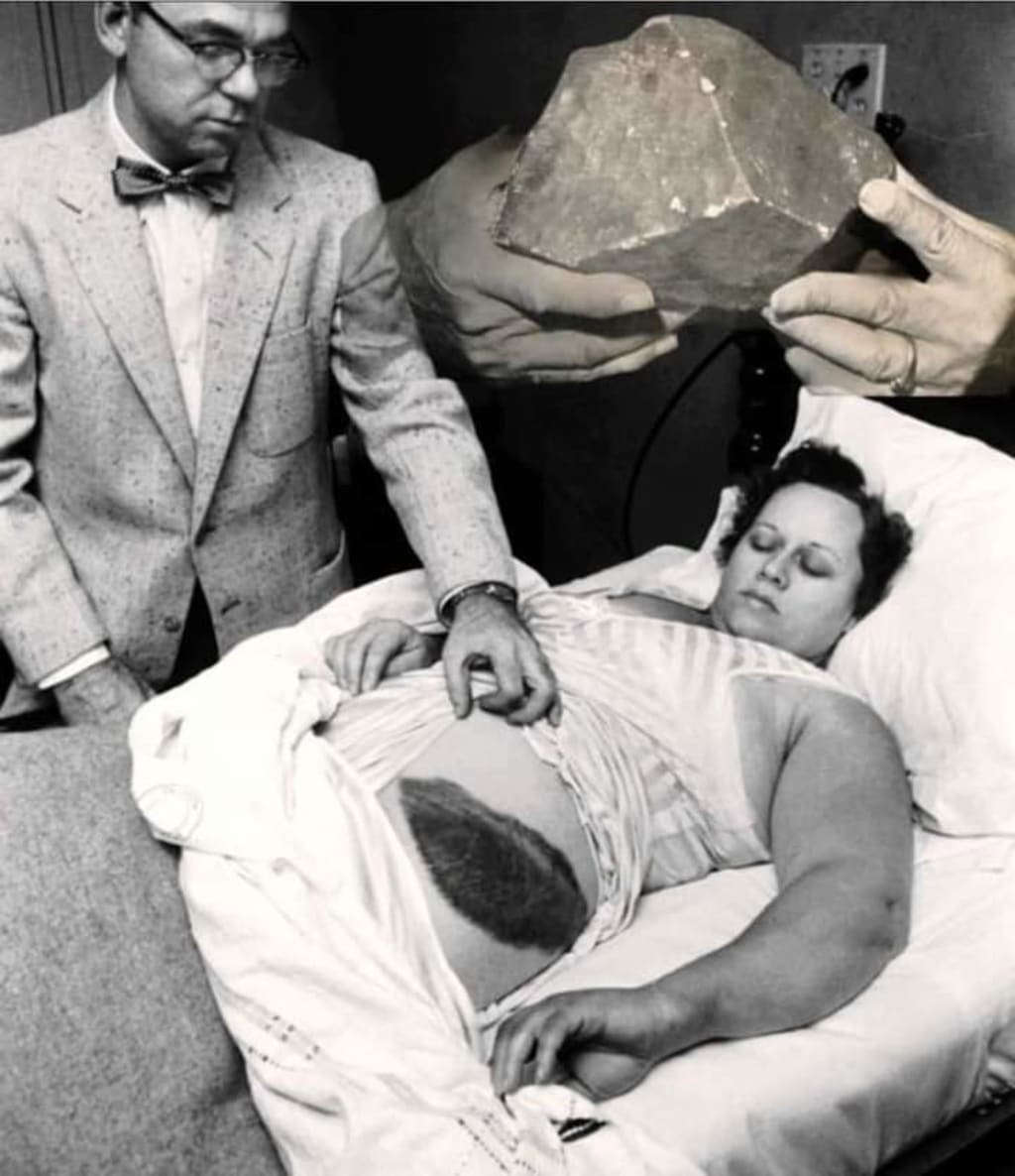 At around 2:46 p.m., the meteorite—a piece of space rock weighing approximately 8.5 pounds and measuring about 7 inches in diameter—pierced through the roof of the Hodges’ rented house. It crashed through the ceiling, struck a large wooden radio, and ricocheted onto Ann Hodges, who was lying on the couch. The impact left her with a severe bruise on her left side, and she woke up in shock and pain, completely unaware of what had just happened.
