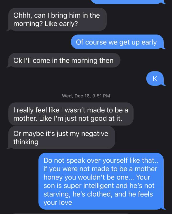 I completely understand that sometimes people just need reassurance and a helping hand. I went to her house at 5:30am and picked up her son. I then took him back to my home and helped him with remote learning while I also taught my 8th grade students.
