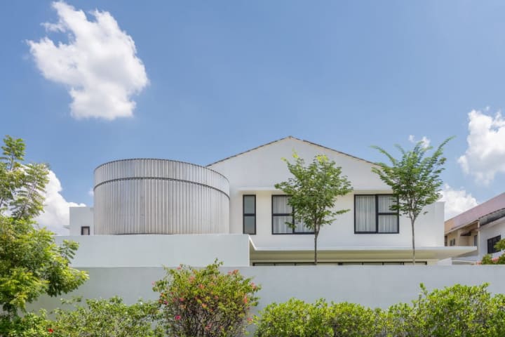 Occupying a corner, a family home is wrapped in minimalist black and white, its white brick wall curving at the corner and greenery peeking over. Nestled in Bangsar, with a stunning city setting, we discovered a house with a fascinating extension of a curious round structure.