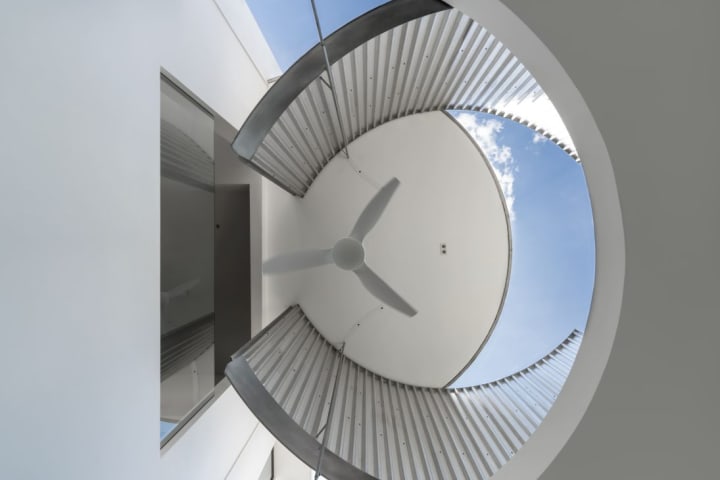 In the corner stands a distinctive spiral staircase leading to a mysterious hatch. In all white, the spiral form blends into the background. Climbing it leads to an open roof viewing deck, built on top of the pavilion extension. It’s an open-air seating area, perfect for cool evenings or star-gazing. This is one of Fabian Tan’s signature pieces.
