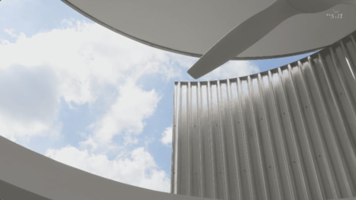 Vertical ridges adorn the inside of the dome roof, and the entire roof is made from shiny metallic material, creating a futuristic and clean look. The reflective surface also makes the room appear larger, and the opening from the first floor overlooks the living room.