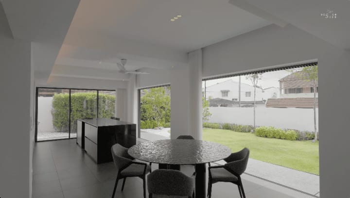 Most of the time when we have sliding glass doors, there’s a fixed panel at the edge, which restricts the opening and view of the garden. The architect, Fabian Tan, came up with an interesting idea where the sliding door panels are hidden behind the column that holds the entire structure of the property. Looking at the floor plan, you can see that when the sliding door opens, the fixed panel hides behind the wall, which functions as a column. This clever idea maximizes the window opening and ensures a direct connection to the private garden.