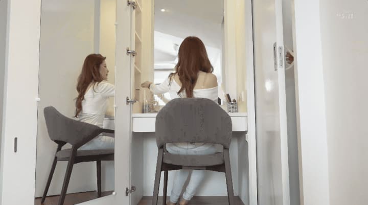 “I don’t like clutter in bedrooms,” Fabian shares. “If possible, I hide it as much as I can. For example, in the bedroom, there are cabinets, and within those cabinets is a hidden dressing table. As you know, dressing tables are always filled with stuff, so I created a cabinet door with a full-length mirror behind it. It can be opened and used, and when it’s not in use, you just close it.”
