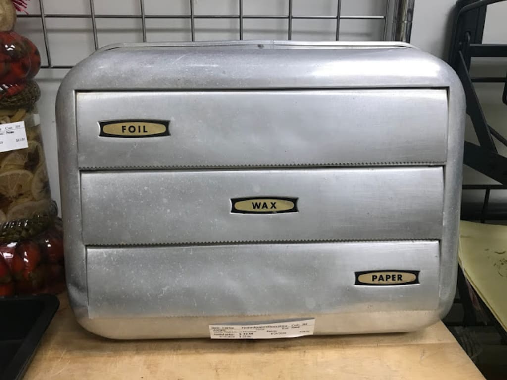 I had just such a moment yesterday when I came across this old metal dispenser for "Foil, Wax and Paper" towels, having spent much of my childhood using one exactly like it that was mounted to my parent's kitchen wall.