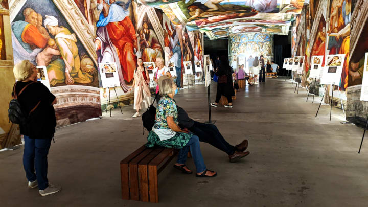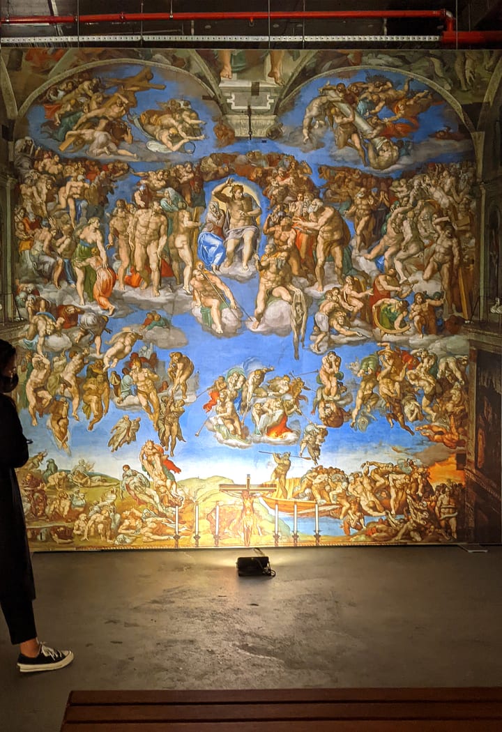The clarity and colour of Michelangelo’s monumental bodies are breathtaking. The scale recreates the artist’s proximity in the process of creation: I too, am close enough to breathe life into his work, brushstroke by brushstroke. Through the audio-guide’s narration, details in the paintings leap out. The artworks in the assembled chapel are larger than life and cinematic in scope. Sophistication is signaled by the elegant baroque chamber music that resonates in the background, re-injecting the grandeur of Michelangelo’s legacy in this artificial, contemporary space.