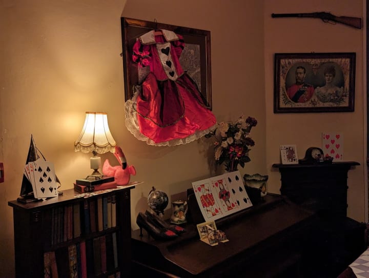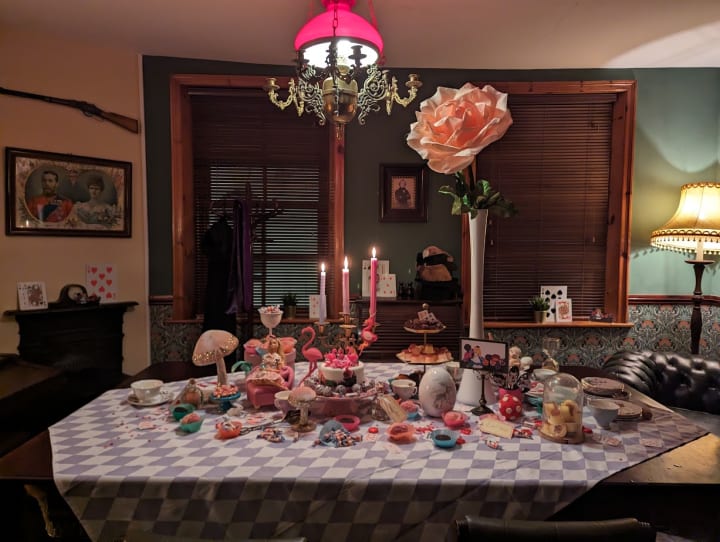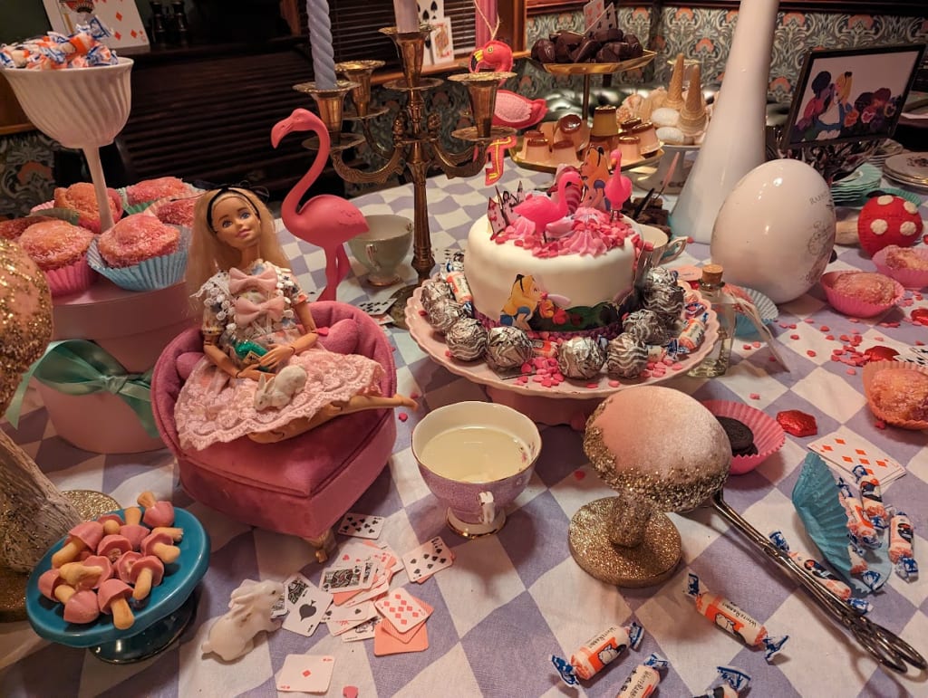 When I got to the Prohibition Bar I wasn't too sure what was happening but assumed Krista's Party was going to be upstairs, and I was right. When I walked in I was greeted with the table of goodies that you saw in the main picture, with Barbie.Moi as Alice and lots of sweets and cake with lots of Lewis Carroll type things, like cards and flamingoes.