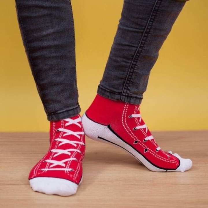 Sneaker style shoes in sock cotton shocks feature bright red and withe cartoon style graphic, giving the appearance of being full of sneakers, from the hi-tops right down to the tread designs on the soles. Your bestie definitely gonna like that gift.