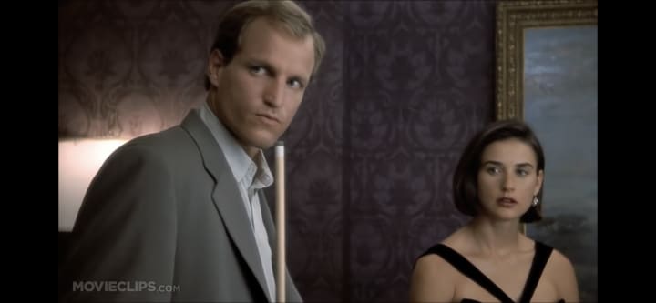A story about a married couple of loved up D’s, David and Diana Murphy played by Woody Harrelson and Demi Moore. High school sweethearts whose young love turns into a long lasting partnership, sure they have their differences but who cares when they make each others pants ignite? You feel how pure and amazing their love is, its almost sickening actually. Sickeningly amazing, am I right? (you can agree with me later, its cool). As well as being obsessed with each other, David works as an architect and Diana works in real estate, the two are very capable people but money isnt something they have at their finger tips. Which is why when they take out a loan to build David’s house, the s**t hits the fan so to speak. Now as with all great movies there’s nothing better than a little conflict to butter our parsnips as viewers, I’m talking about the fan-s**t, aka the recession. A recession hits and David and Diana end up falling behind on their loan repayments leaving them in a bit of a pickle, feeling down on their luck they take off to the bright lights of Vegas to turn it around. It‘s there they meet John Gage (Robert Redford) the sexy billionaire, whose charisma, power and money emanates unequivocally, I almost questioned my own sexuality (for 1 second.. if that). The buzz of winning fills the screen as Gage gives both D’s a taste of the rich life, this is of course before he proposes the question that will test the sanctity of marriage verses the love of money.