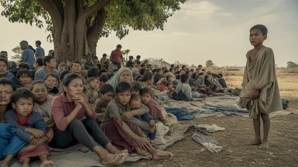 On the tenth day, as families shared food under the tree, gunfire cracked in the distance. A stray bullet struck a Meitei elder in the leg. Panic exploded—mothers grabbed children, men scattered.