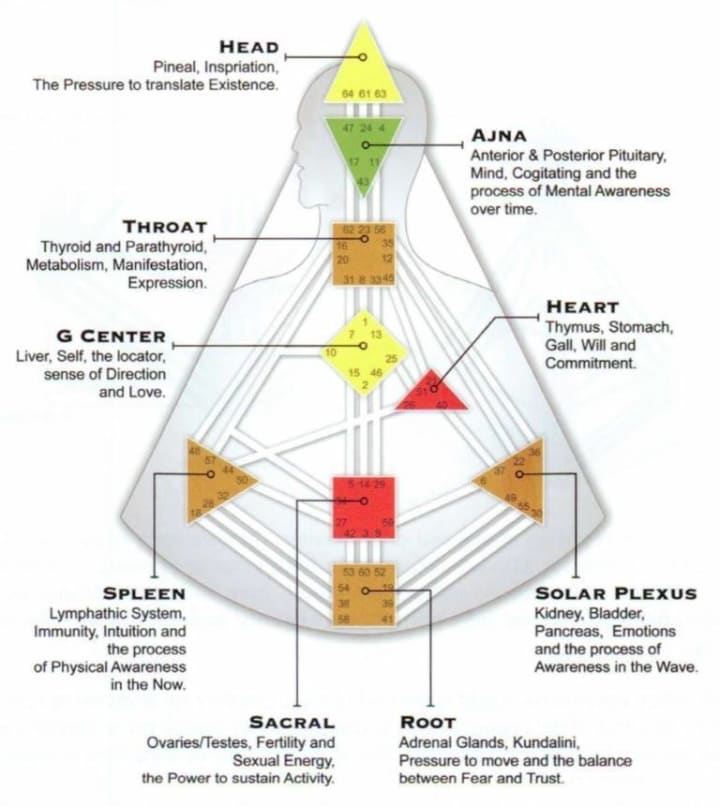 Centers: The body graph features nine centers, each corresponding to different aspects of human experience, such as communication, emotions, and intuition. These centers can be defined (colored in) or undefined (white). Defined centers indicate consistent energies, while undefined centers are where you might take in and amplify energies from others.