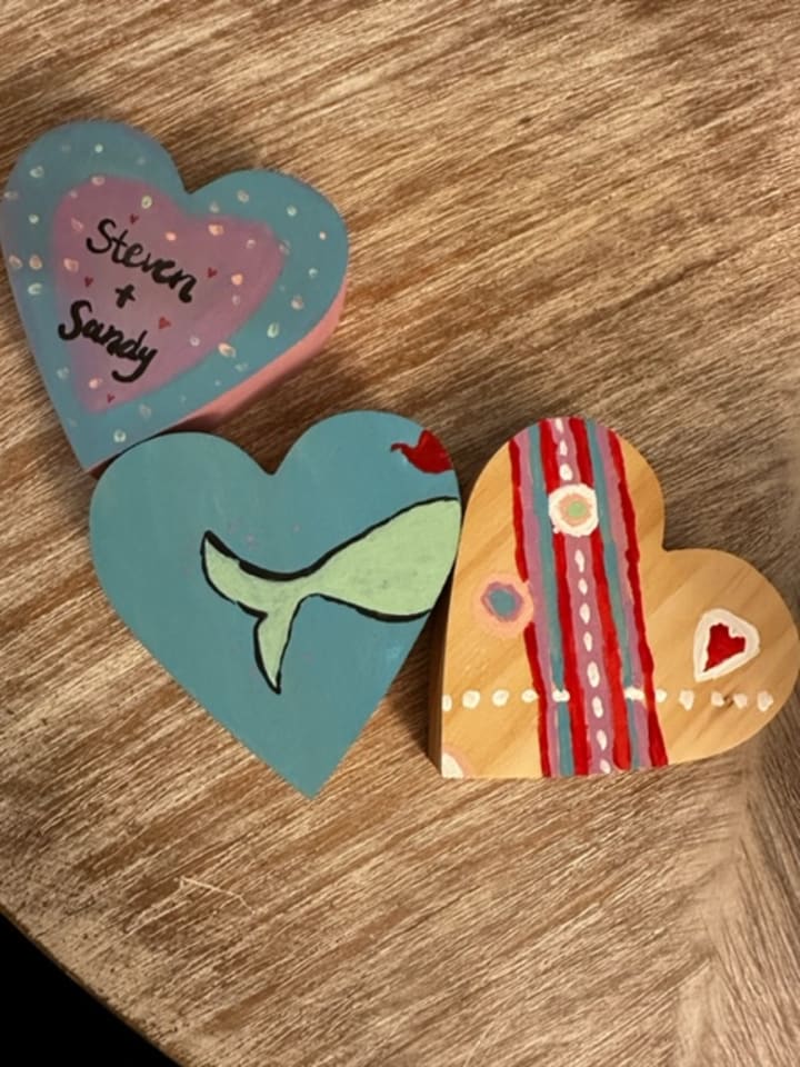Steven picked up a wooden heart painting kit he found at Target. It came with 3 wooden hearts, 2 paint brushes, and 6 paint colors. We each painted one heart and then we both contributed to the third one, but Steven did most of the artwork. While we worked on this craft project, we put on "Forgetting Sarah Marshall" -- a movie we have both seen many times -- for background noise and laughs.
