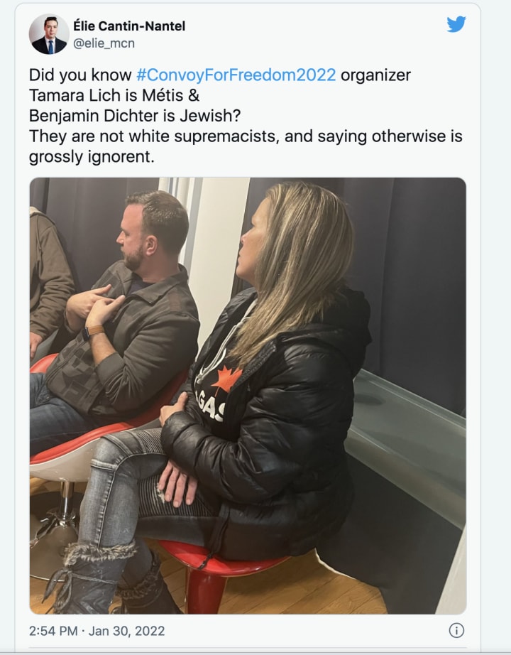 Some have noted the participation of marginalized community members in this convoy, and images have been circulating of a “pow-wow” with Indigenous participants. This has upset Indigenous Peoples on several platforms where these videos and images have been shared as there is blatant disrespect of cultural customs to the practice, making this display a tokenized aspect to demonstrate – although poorly – that members of the protest “aren’t racist.” Additionally, and to the same effect, in a Twitter post, Élie Cantin-Nantel writes that since Tamara Lich is Métis and Benjamin Ditcher is Jewish they cannot possibly be white supremacists, and those who say such things are the ignorant ones. The ignorance in this remark is laughable, to think that being part of a marginalized community means that you’re immune to being racist at some point or another is largely incorrect; we all have anti-racist work to do, no matter what oppression you’ve faced. All the more, why is there no evident outrage against the groups that have shown their racist ideologies when some of the organizers have claimed their ties to targeted communities? Accountability and control are lacking severely in this movement.