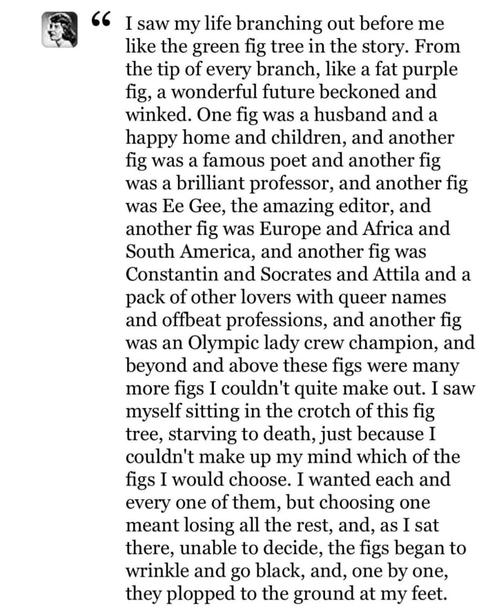 In the novel, a profound symbolism emerges when Esther sees her life branching out before her like a fig tree laden with ripe fruit, where each fruit represents a life choice: a career, marriage, motherhood, travel, independence… But she sat hesitant under the tree, unable to choose and paralyzed by the fear of picking one fruit and losing the rest; so she remained still in her place until the fruits rotted and fell one after the other. Thus, Plath summarizes the dilemma of modern man: the abundance of choices that turns into a burden, and the freedom that paralyzes instead of liberating.
