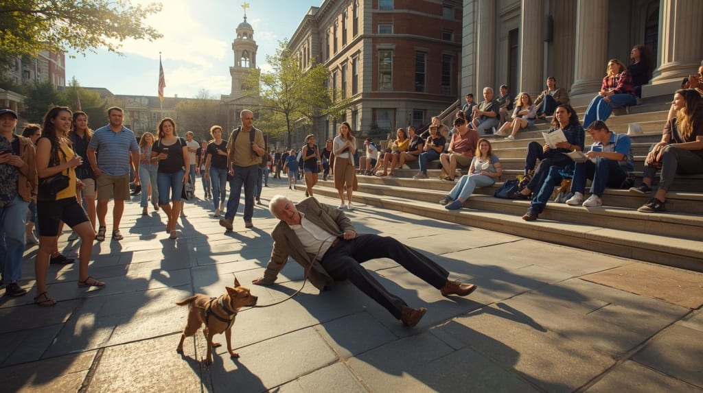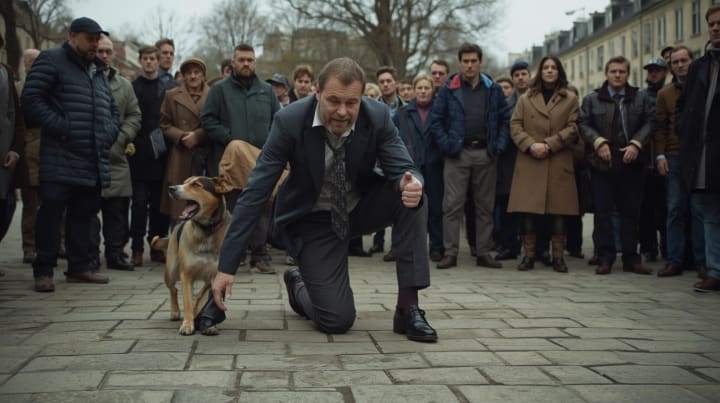 It was a perfect Tuesday afternoon, the kind where the sun feels like a gift. The downtown square was bustling with people on lunch breaks, tourists consulting maps, and students lounging on the steps of the old courthouse. In the midst of this, an elderly man, Mr. Evans, was walking his small, terrier mix when he suddenly stumbled. His leg buckled, and he fell hard onto the pavement, letting out a sharp cry as his head snapped back. The little dog yelped and strained at its leash.