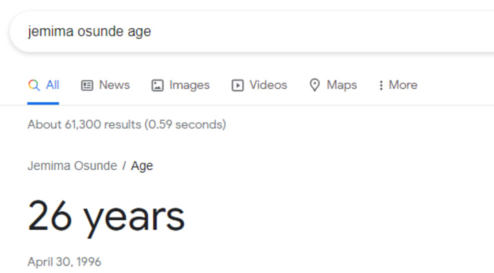 Nollywood actress Jemima Osunde has been in the industry for quite some time now. Since bursting into the national conscience with her role in Shuga, she has gone on to amass quite a name for herself. But, one thing that has been the topic of a lot of speculation for many years is Jemima Osunde's real age. Many people have guessed and today, if you even Google "Jemima Osunde age", the response that will come out is 26. Even Google has it wrong: