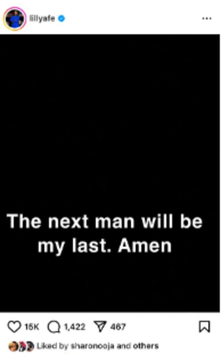 Well, it seems like one person who is also ready to be done with the single life is Nollywood actress Lilian Afegbai who took to social media to make a post where she publicly declared saying: The next man will be my last.